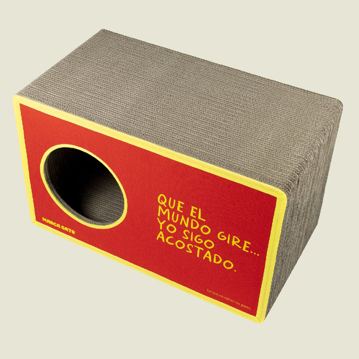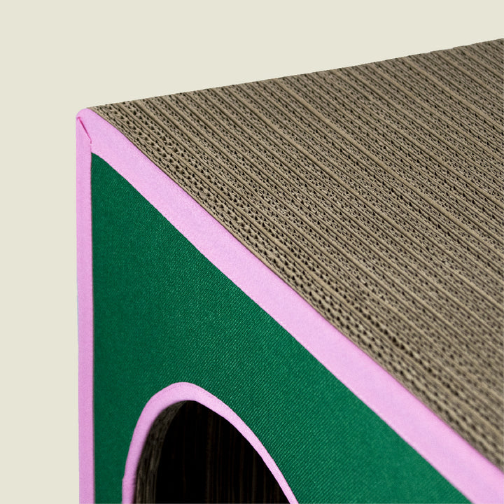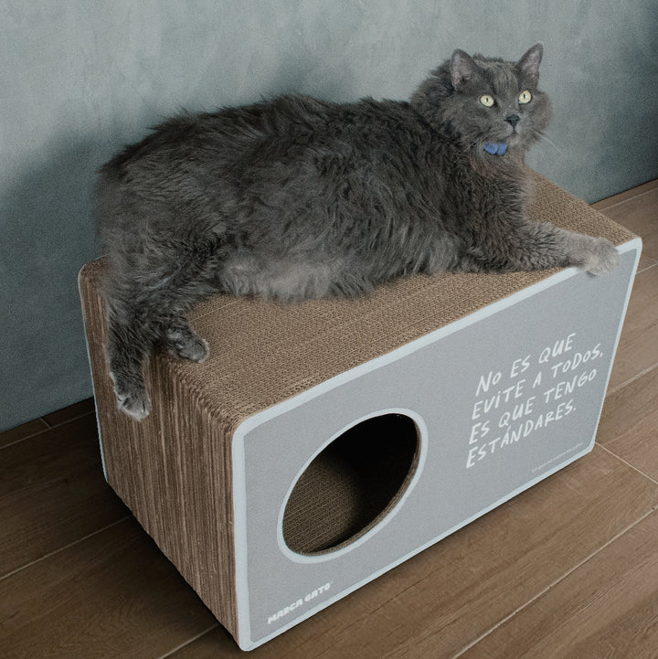 Rascador para gatos en cartón corrugado doble pared, frontales con textiles anti rasguños para proteger el rascador y dar estética a tu hogar. Con cueva al interior ideal para que tu gato exprese su conducta natural de rasguñar y de buscar lugares de guarida. Su tamaño potente lo hace el rascador para gatos ideal para hogares con varios felinos, gatos pesados o de gran tamaño.