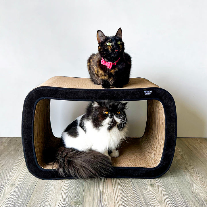 El rascador Brownie es espacioso con dos niveles de rascado y descanso. Su diseño minimalista y compacto evoca el comportamiento y preferencia de los gatos por estar dentro de cajas.